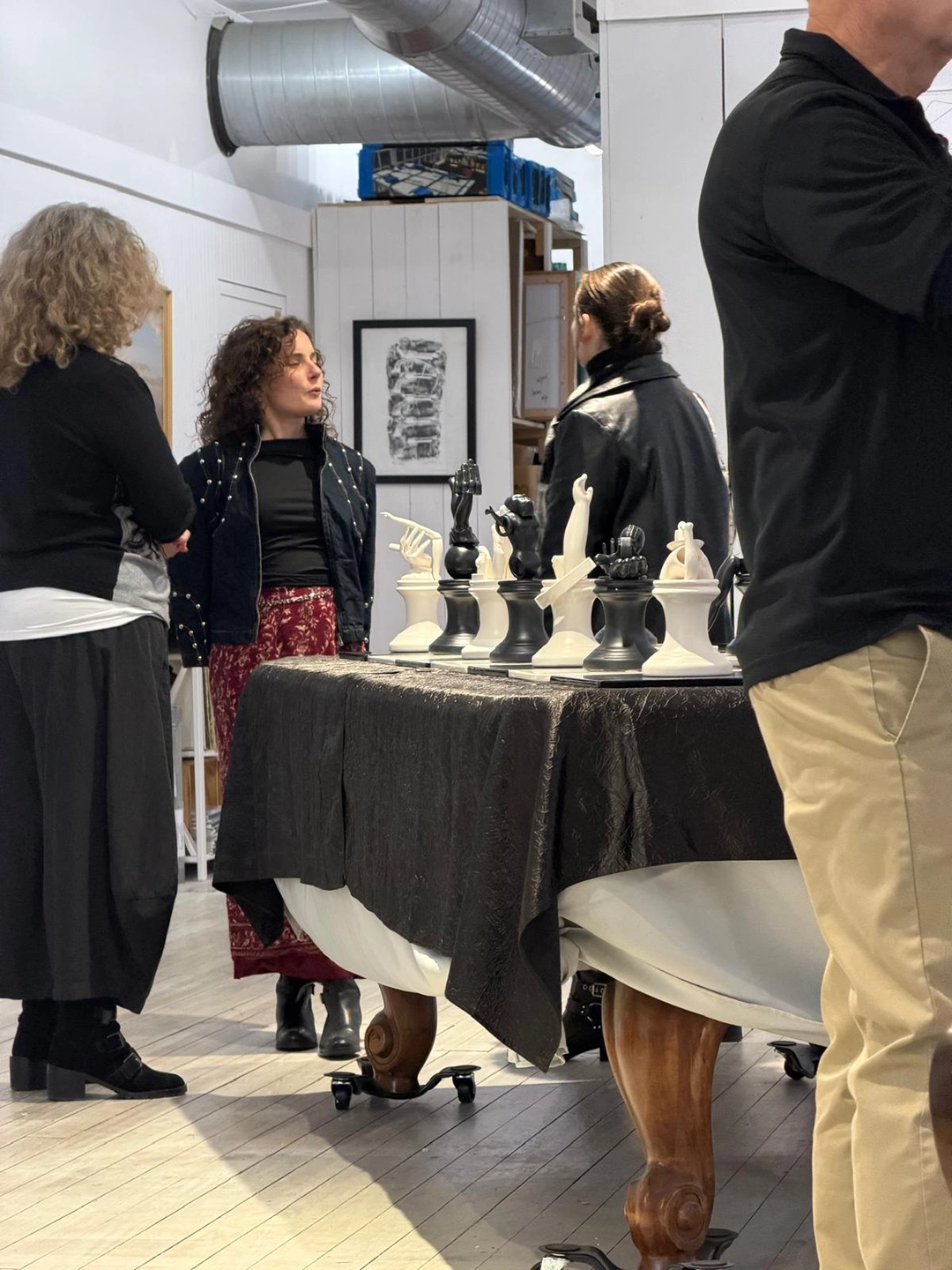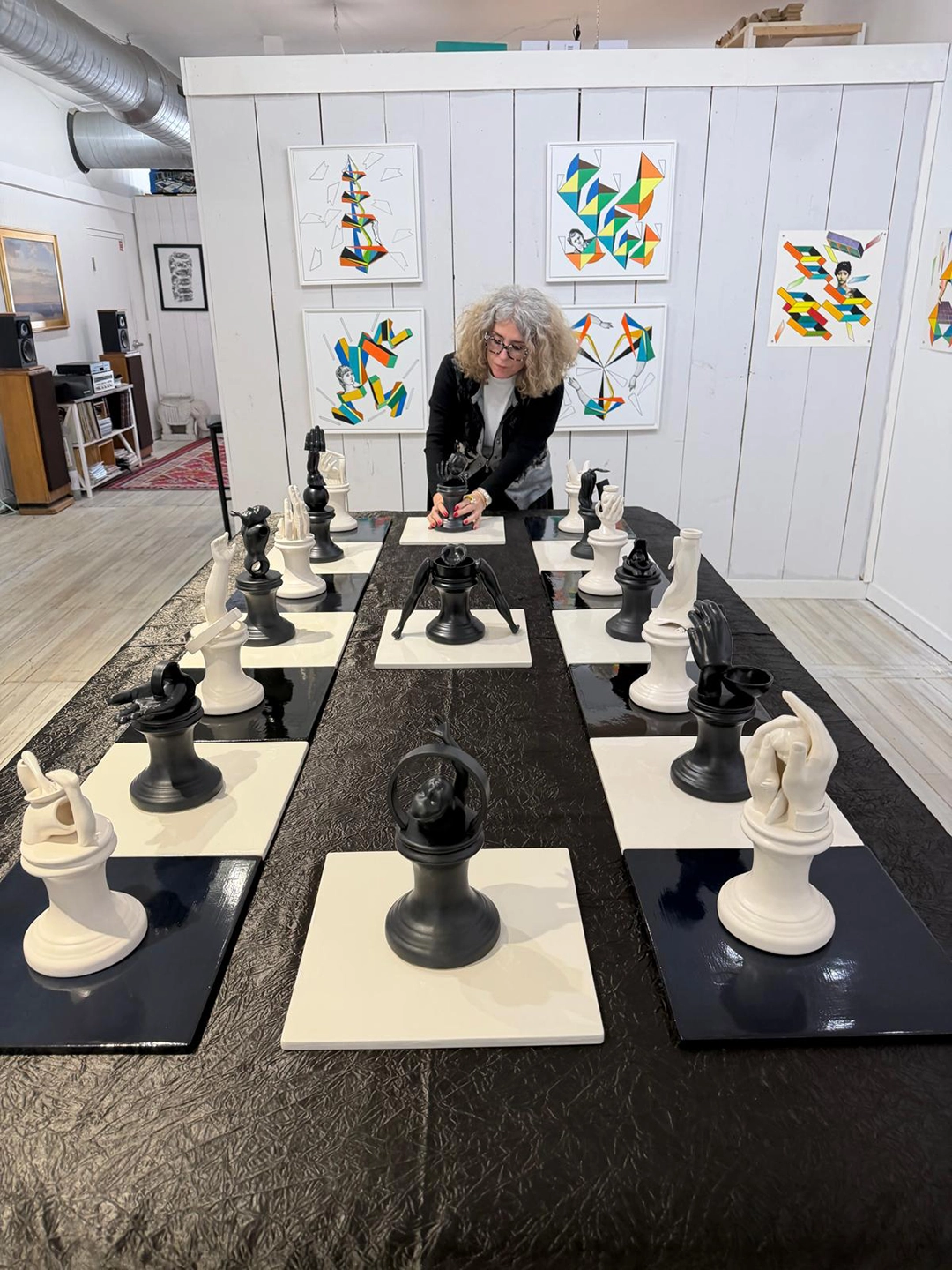 The large-scale three-dimensional board connects the game to multiple narrative associations, through processes of reorganization, remixing, and the play of correspondences between self-referential knowledge and the metaphor of the vital 'gambit. Within this framework, Ferrer mobilizes the idea of fictional narration—centered, erased, mimetic, and projected outward—interwoven with elements of social and historical reference. From its inception, the project has been sustained by the logic of combination. The board functions as a model of relations, where each piece acquires meaning according to its position and its potential movements. This system enables parallels between the game and broader dynamics tied to decision-making, conflict, and strategy. The work does not represent these ideas directly; it activates them through its own internal structure.