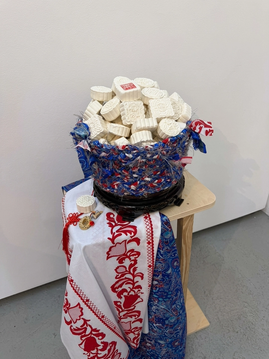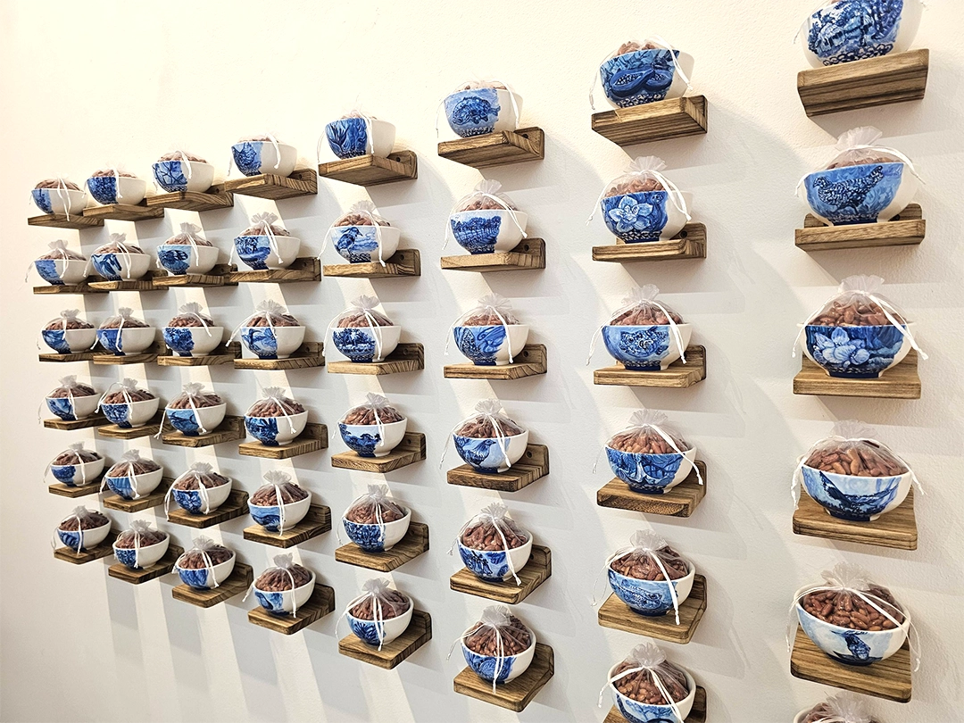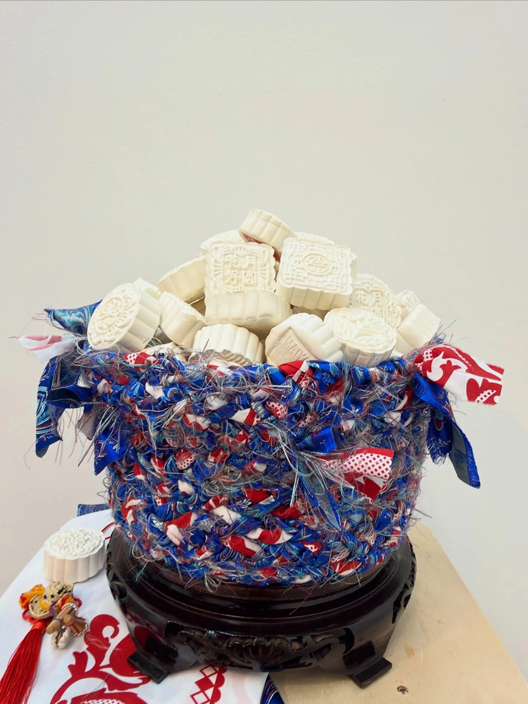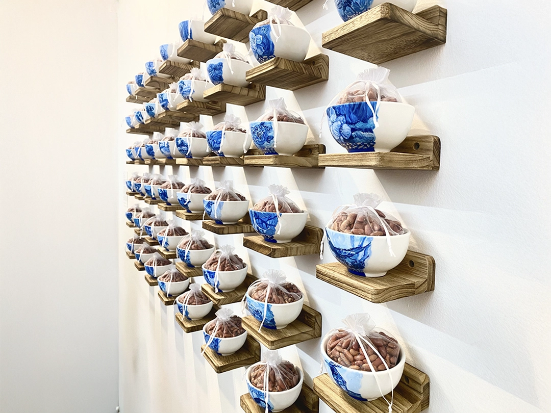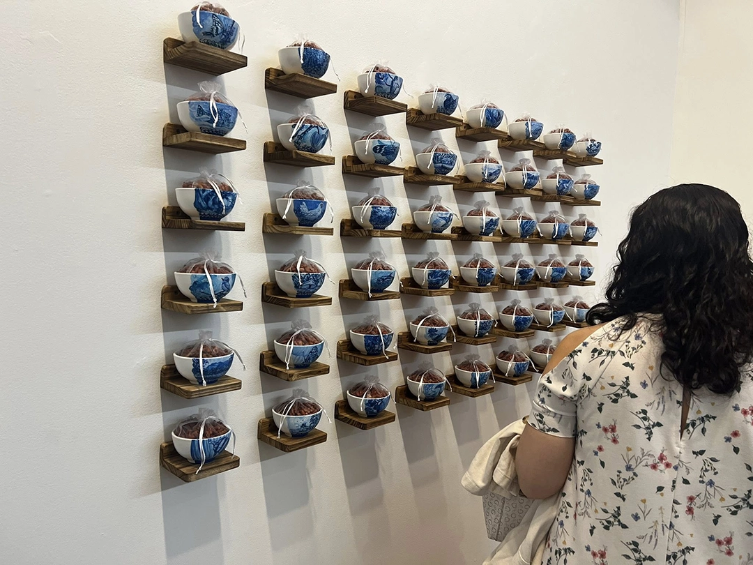 The installations operate as small altars. They function as intimate sites of mediation between the personal and the collective, the living and the ancestral. The relationship with the works is activated through proximity, through a form of attention that involves the body. The materials are modest and direct—spoons, hilo pabilo, incense, rice vessels, beans, textiles, mooncakes—and within them a concentrated affective charge displaces their utilitarian condition. Each object holds a story, a bond, a continuity.