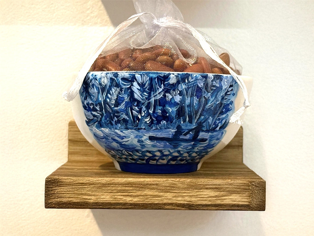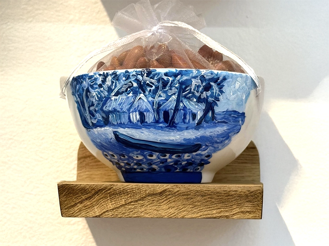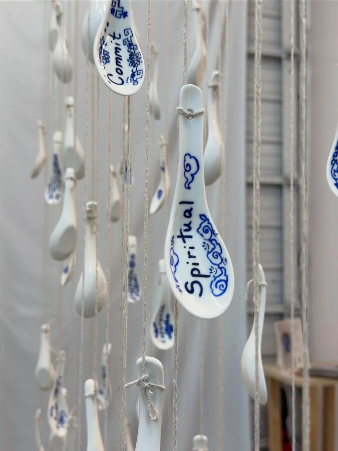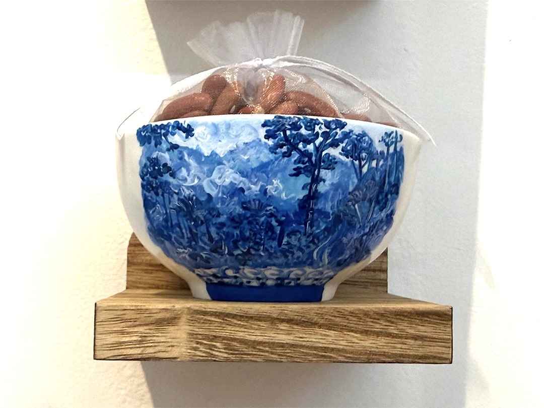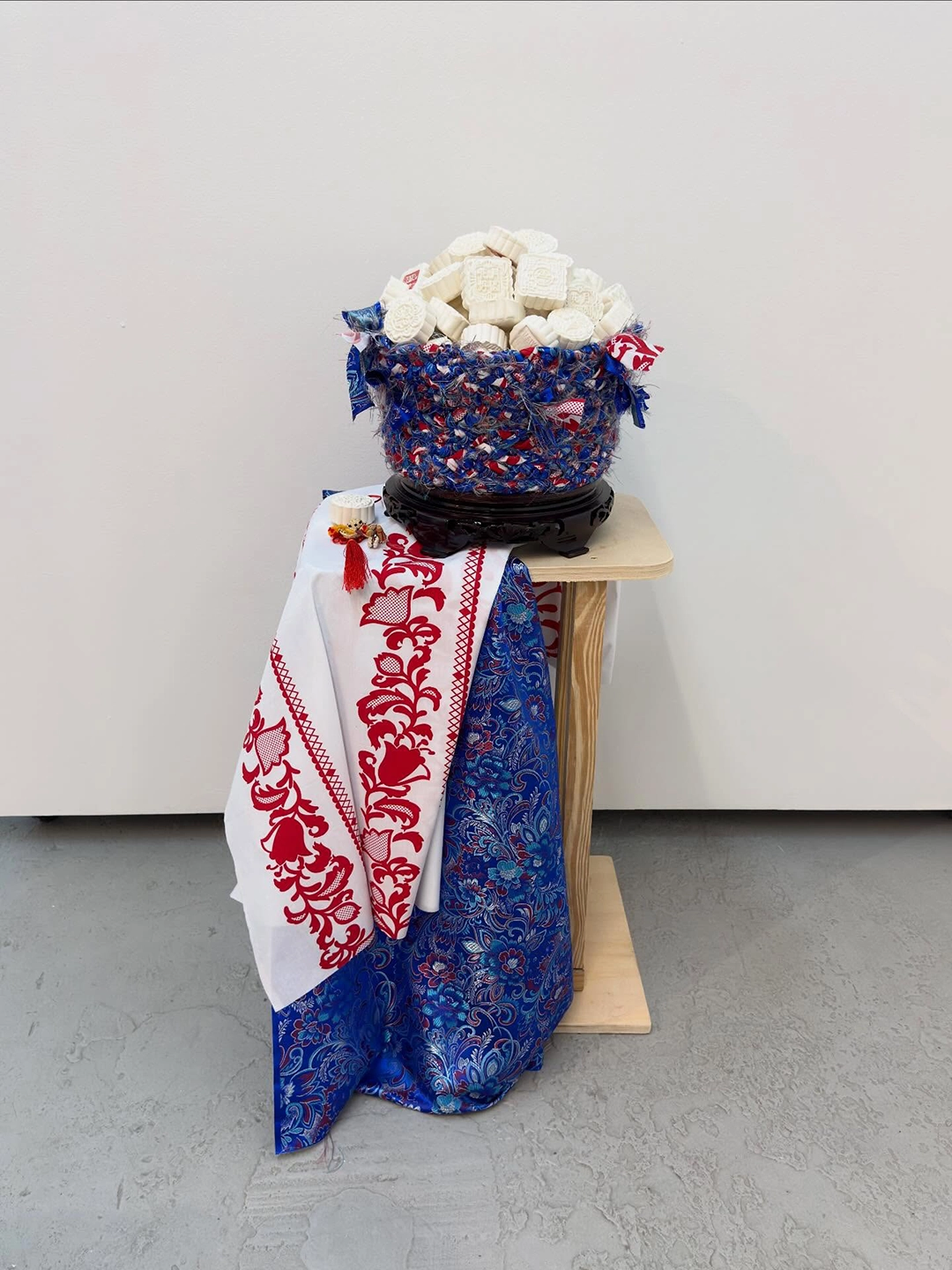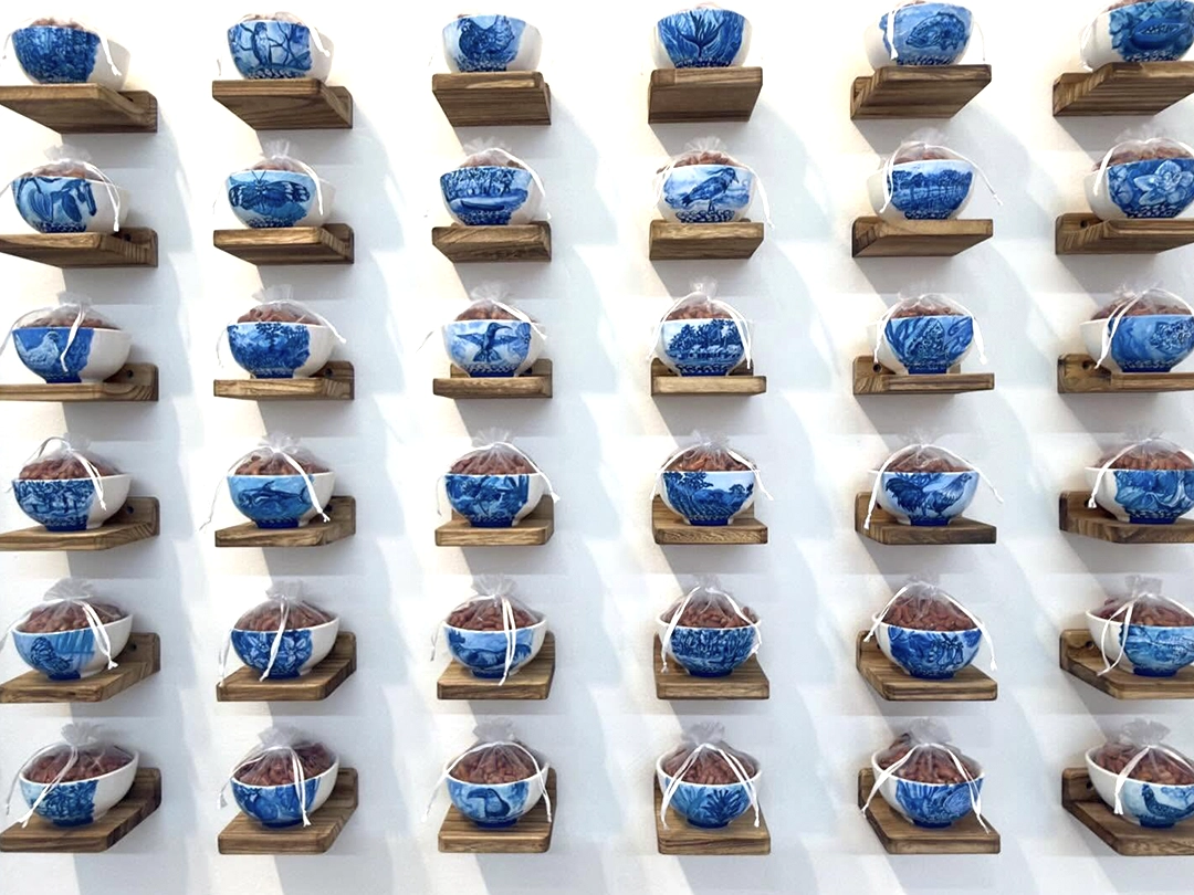 The installations operate as small altars. They function as intimate sites of mediation between the personal and the collective, the living and the ancestral. The relationship with the works is activated through proximity, through a form of attention that involves the body. The materials are modest and direct—spoons, hilo pabilo, incense, rice vessels, beans, textiles, mooncakes—and within them a concentrated affective charge displaces their utilitarian condition. Each object holds a story, a bond, a continuity.