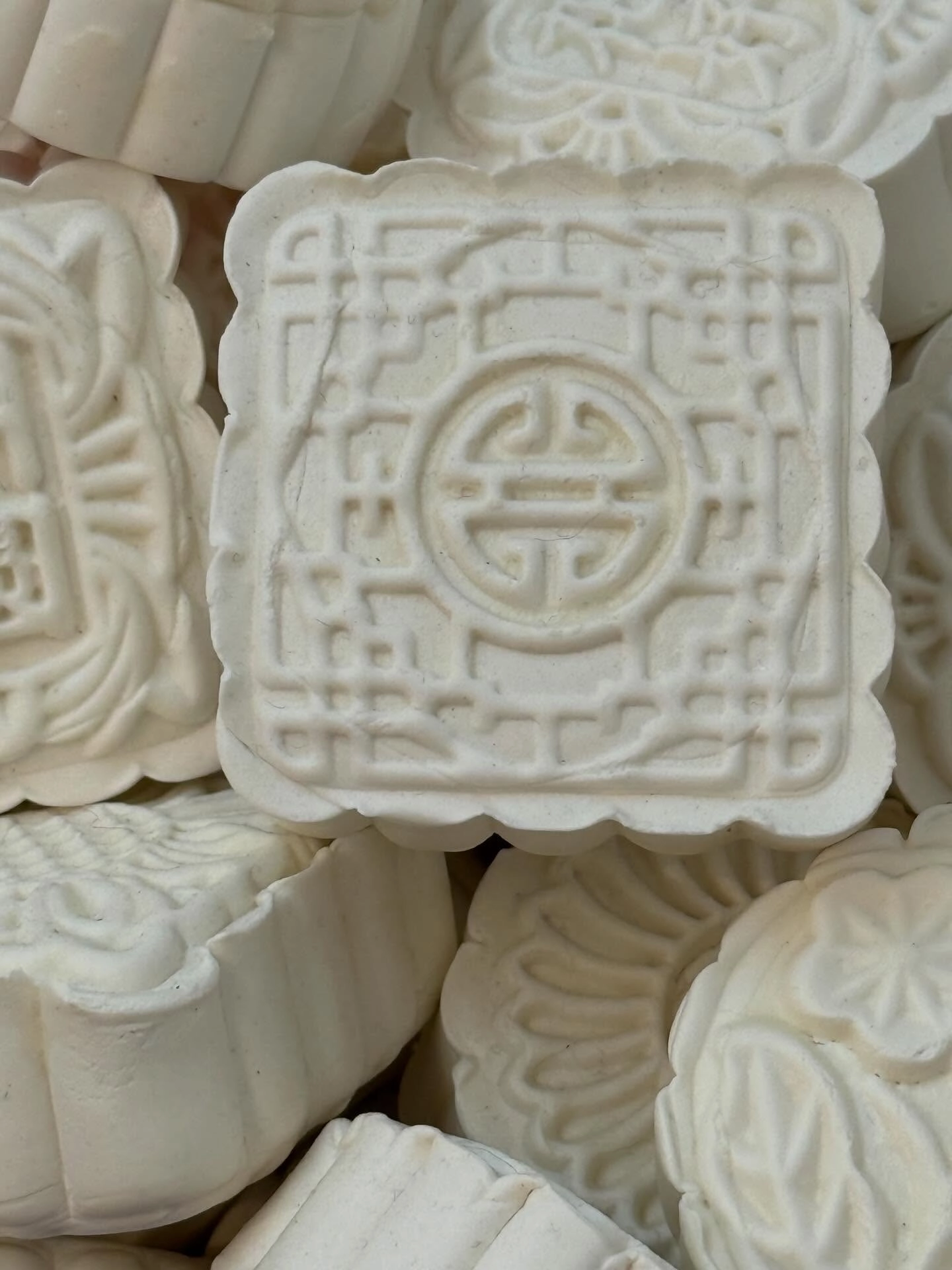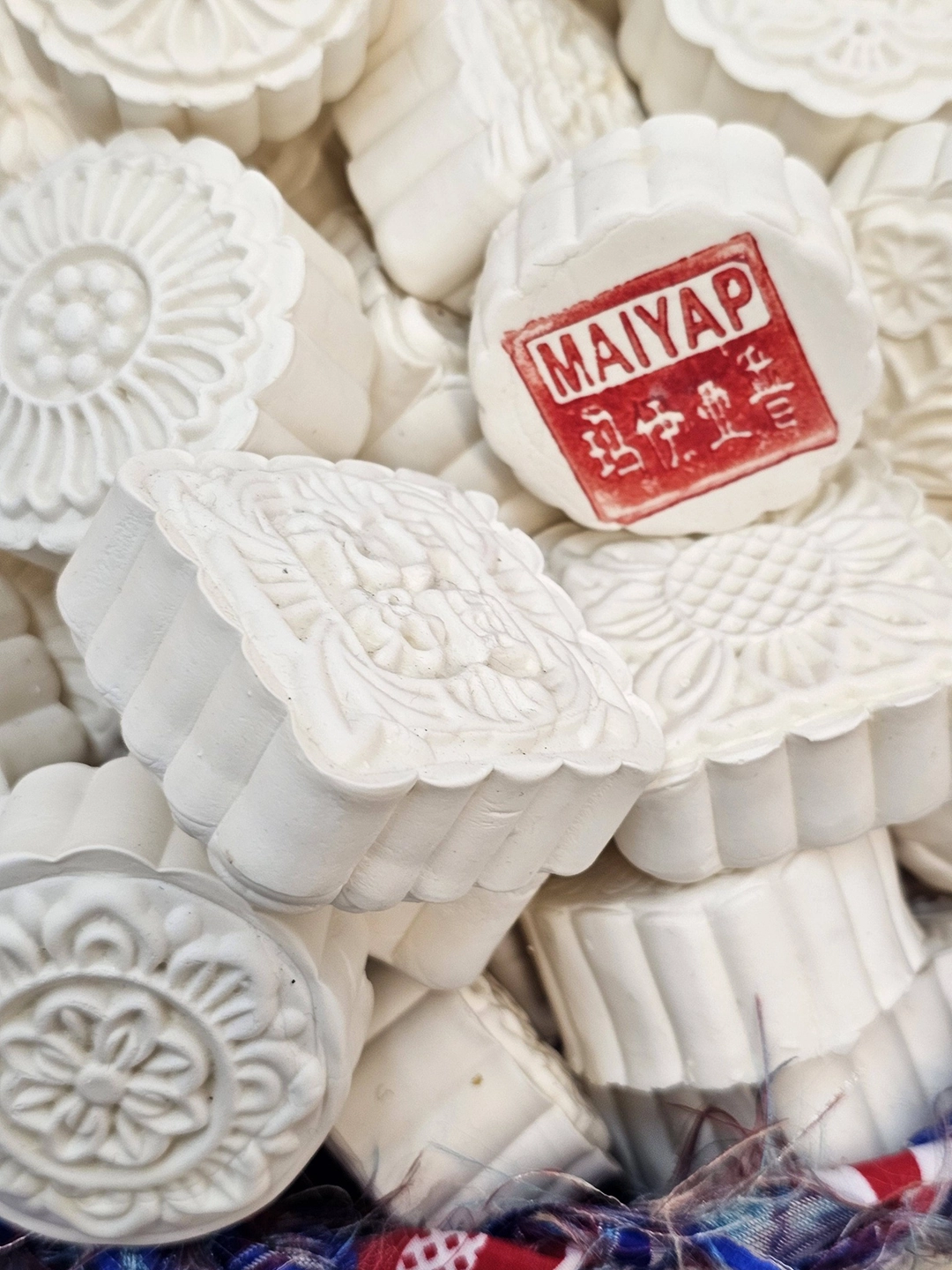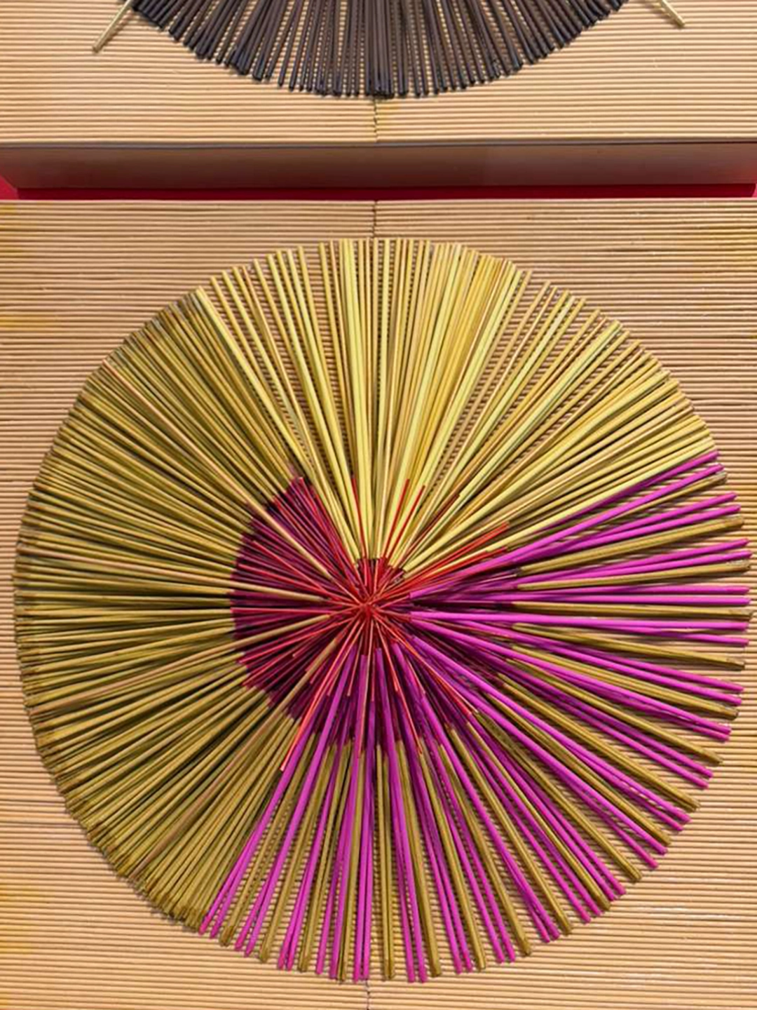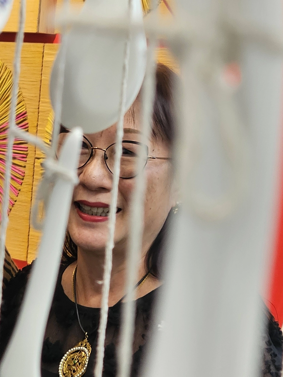 The installations operate as small altars. They function as intimate sites of mediation between the personal and the collective, the living and the ancestral. The relationship with the works is activated through proximity, through a form of attention that involves the body. The materials are modest and direct—spoons, hilo pabilo, incense, rice vessels, beans, textiles, mooncakes—and within them a concentrated affective charge displaces their utilitarian condition. Each object holds a story, a bond, a continuity.