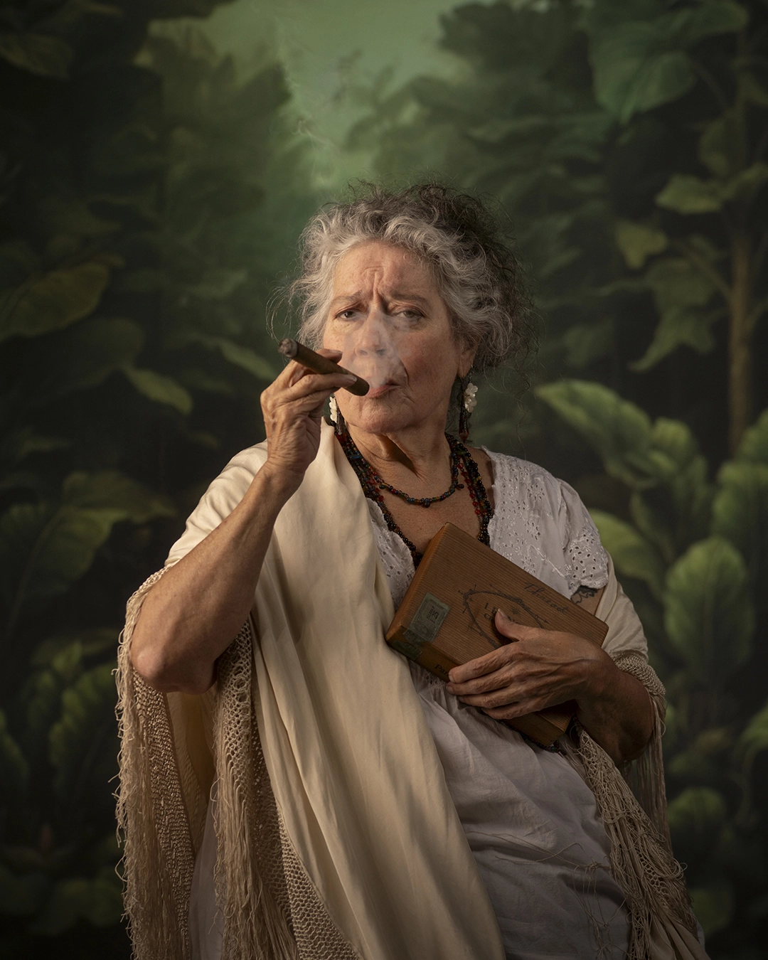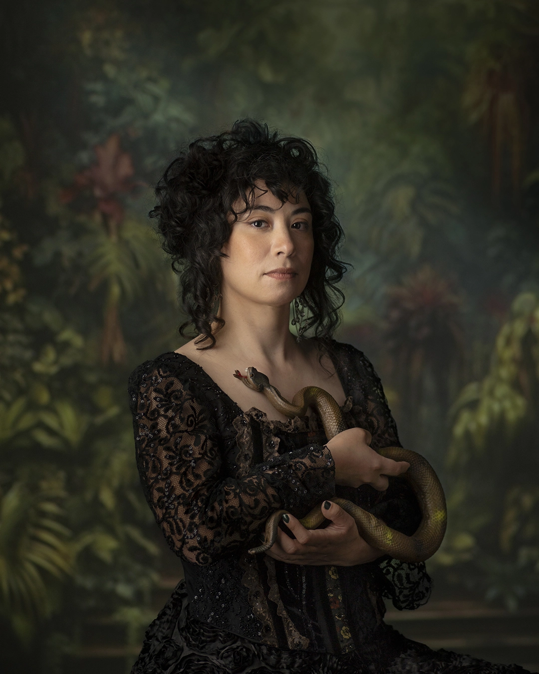The natural elements accompanying the figures introduce another layer of meaning. Animals, plants, and symbolic objects reinforce a relationship with notions of origin, care, and transformation. These elements do not function as ornament but as part of a visual system that expands the semantic field of each image. The result is a body of portraits that operate as open scenes, where each component contributes to the production of meaning.