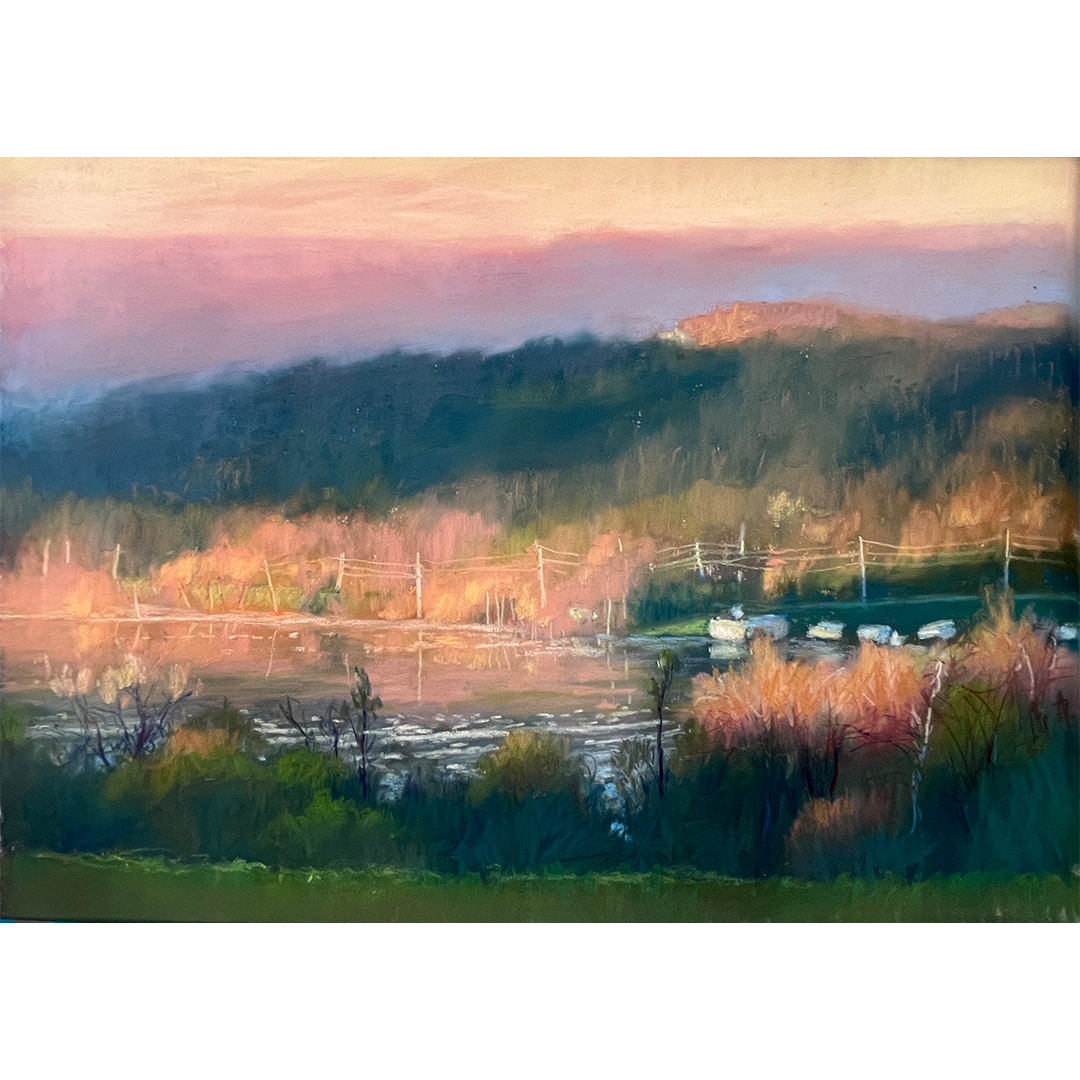 A decisive turning point in her career came with her arrival at the Pendleton Art Center, where she has maintained a studio for more than three decades. Within that dynamic community of artists, Hurley developed a painting practice centered on landscape and on the expressive power of color—an interest enriched by her mentorship with the celebrated colorist Wolf Kahn. Over the years, her work has been exhibited in galleries across the United States and featured in numerous publications, while her teaching and mentorship have shaped generations of emerging artists.