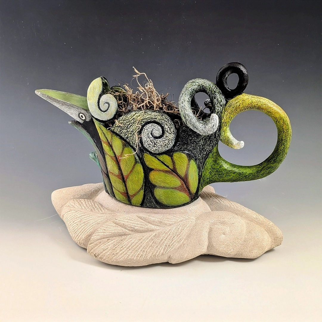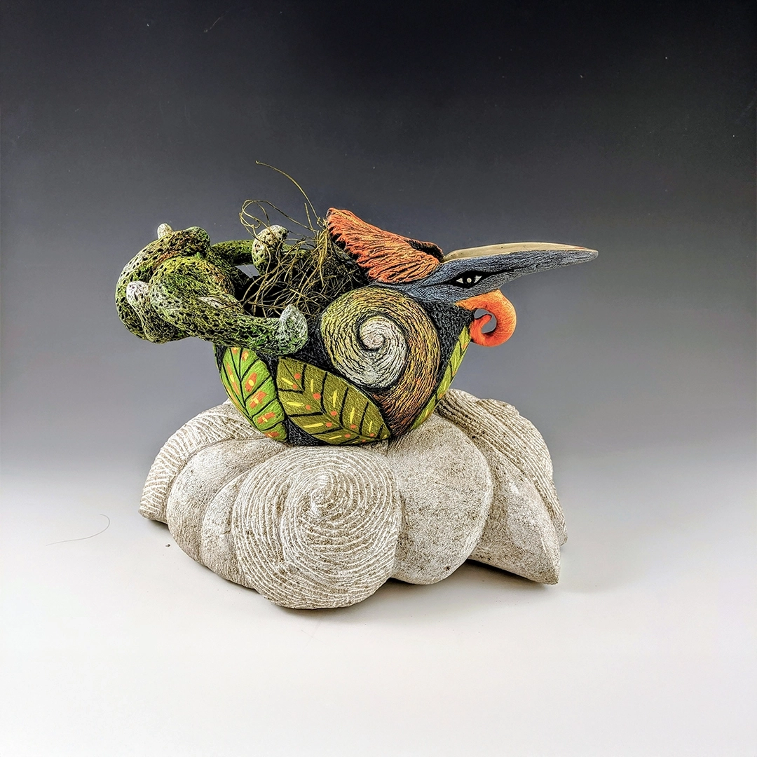 Karen Heyl, a sculptor with a background in stone carving and bas-relief in Indiana limestone, integrates ceramic, drawing, and mixed media to create forms inspired by organic growth, birds, and the transformative energies of nature.